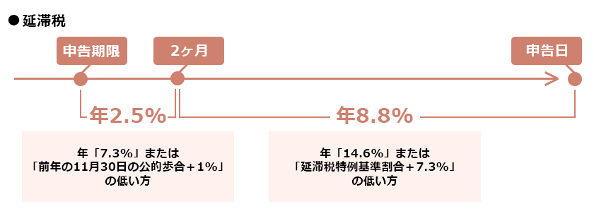 申告義務があるにも関わらず申告をしなかった場合、「無申告加算税」と「延滞税」が加算されます。 延滞税は利息のようなものと考えてください。期日を過ぎた日数に応じて加算されます。それぞれの税率は以下のとおりです。