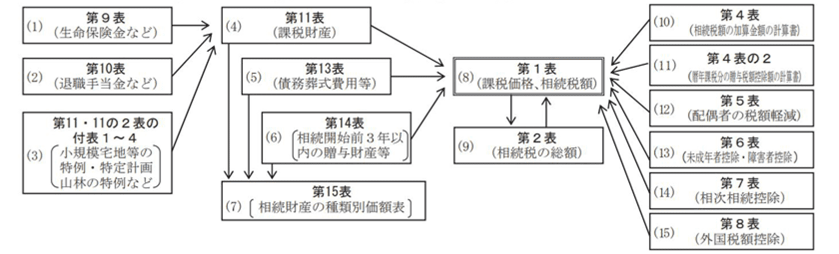 申告書は第1表から第15表まであり、相続財産の種類や適用される控除によって準備する用紙が異なります。