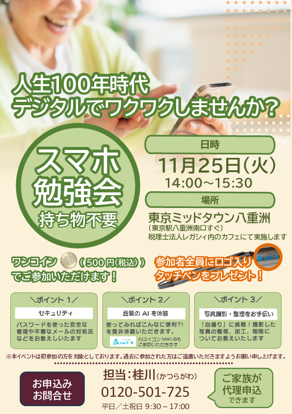 レガシィが参加費500円(税込)のスマホ勉強会を開催いたします。11月の開催はセキュリティ対策についてお伝えいたします。